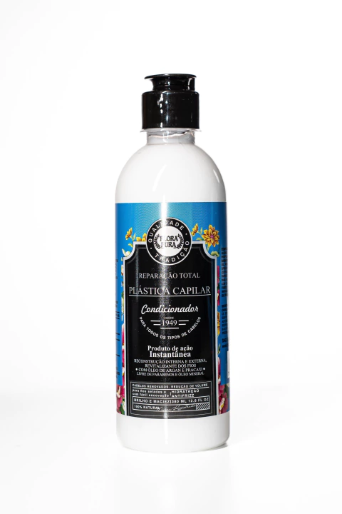 Condicionador Plástica Capilar Flora Pura possui uma formulação livre de parabenos e óleo mineral. Enriquecido com óleos de argan e pracaxi que ajudam a recuperar a fibra capilar, reconstruindo, selando os fios e reduzindo gradativamente o volume. Promovendo brilho, maciez e condicionamento, beneficios que são percebidos desde a primeira aplicação. Pode ser usado em todos os tipos de cabelo. Repõe aminoácidos e repara danos. Não pesa os fios. Contém ativo protetor térmico. Produto livre de parabenos e óleo mineral. Indicado para todos os tipos de cabelo.